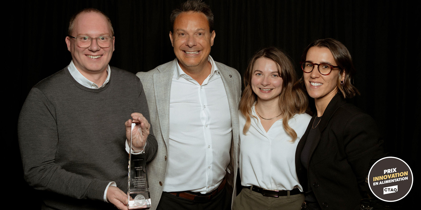 Lors du gala, Cyrille Vaucelle, Vice-président Innovation & Technologie et Éric Tessier, Président et chef de la direction ont eu l’honneur d’accepter le prix au nom de Groupe CIS. Nous voulons aussi saluer Marie-Christine Plouffe et Stéphanie Luna, qui étaient présentes pour représenter Moov AI et partager ce moment avec nos partenaires Boulangerie St-Méthode et Dion Herbes & Épices. Ce fut une soirée mémorable, remplie de fierté et de belles rencontres.